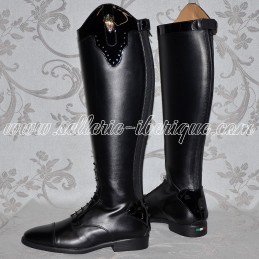 Bottes d'équitation en cuir Fellini. 100% MADE IN ITALY et fabriquées à la main par les Maîtres Artisans bottiers Fellini. Empeigne en cuir vachette. Semelles cousues et collées. Bande élastique à l'arrière pour un meilleur confort et un meilleur galbe. Taquets d’éperon fixé sur la protection de zip. Conformément aux articles L.121-20 et suivants du Code...
